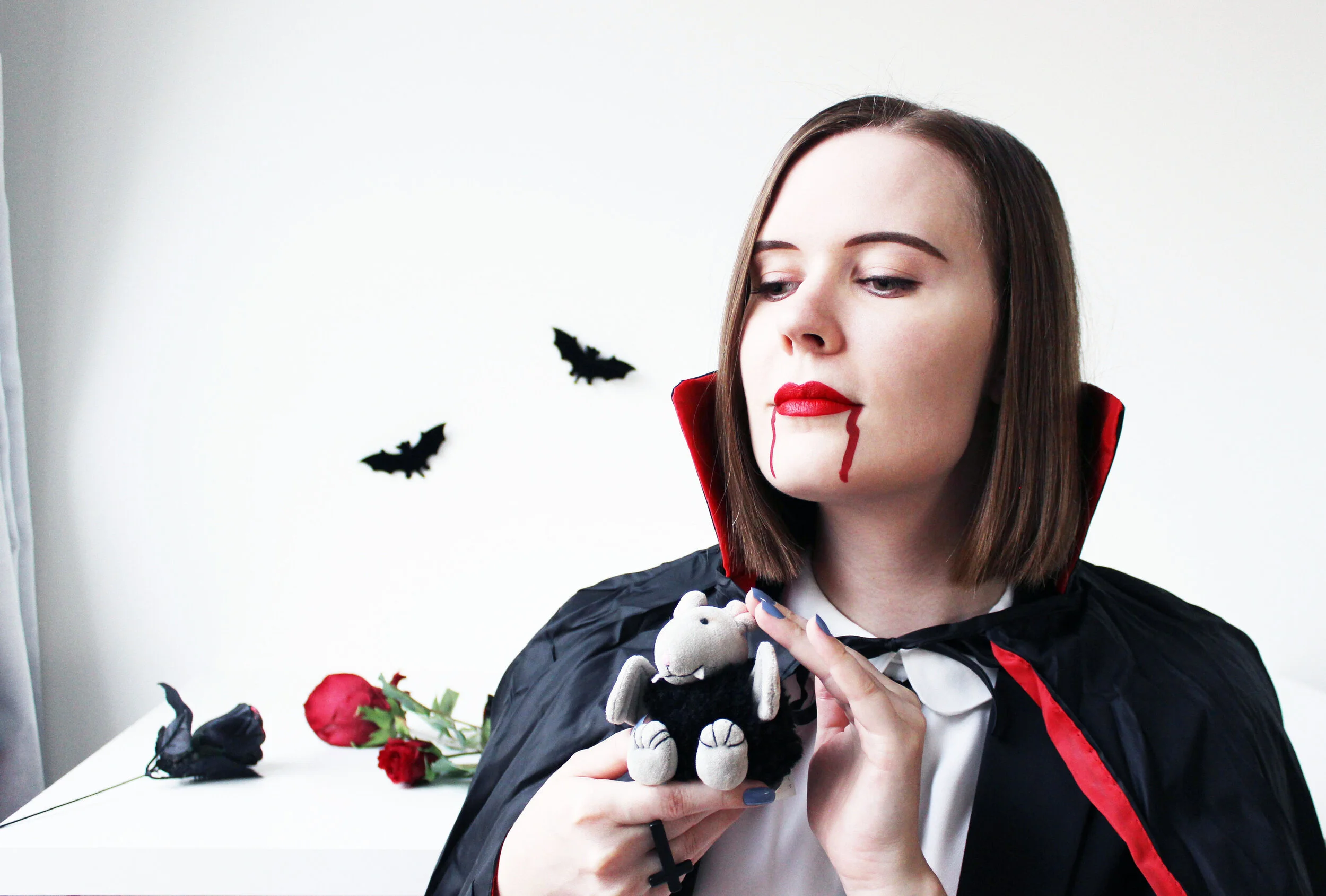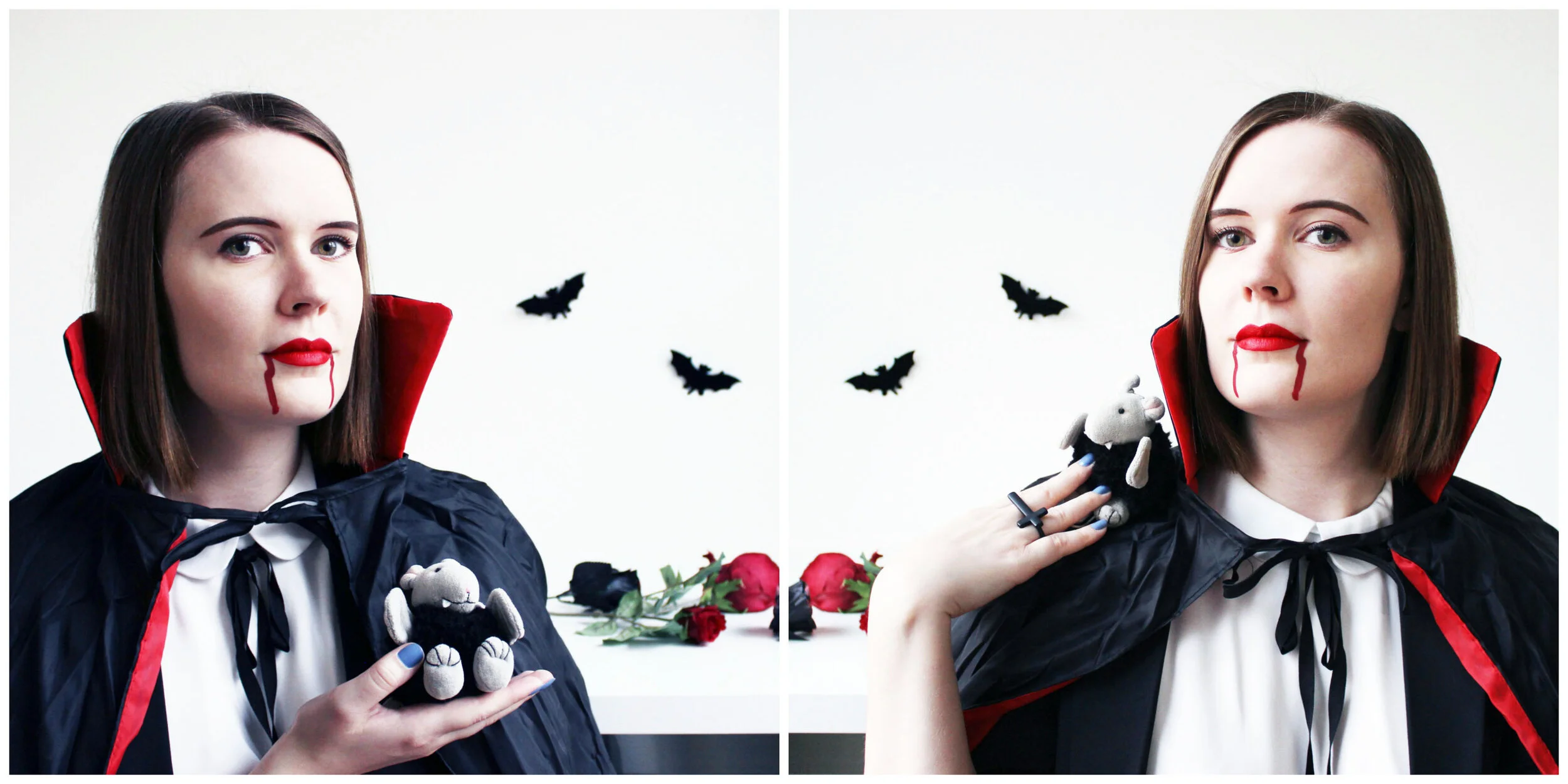 The vampire cape came from Stonemanor, a British Store, here in Belgium, that likes to go all out when it comes to Halloween. I even got some spider web tights and tablecloth there (the latter which I use as a makeshift cape in the look below #improvising).